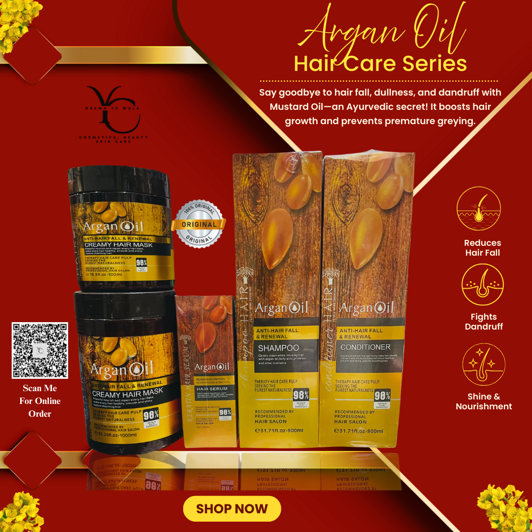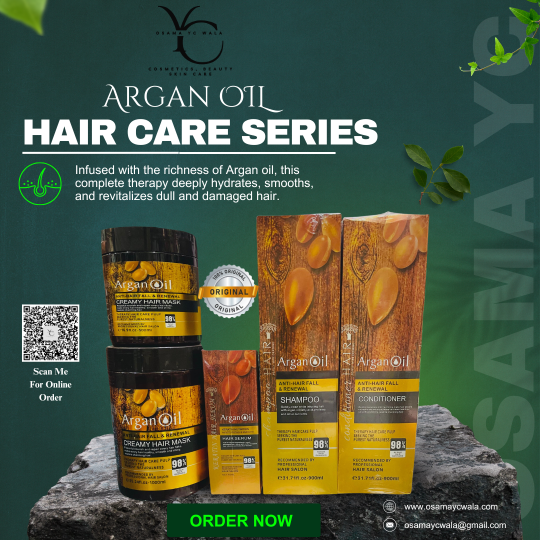 Experience the power of Argan Oil Hair Care Anti-Hair Fall & Renewal Series, specially designed to restore, strengthen, and protect your hair from root to tip. This complete set includes Shampoo, Conditioner, Hair Serum, and Creamy Hair Mask – each infused with 98% natural argan oil extracts and advanced hair-repair technology.
